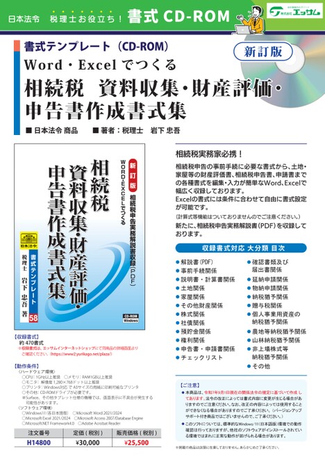 相続税申告の事前手続に必要な書式から、土地・家屋等の財産評価書、相続税申告書、申請書までの各種書式を編集・入力が簡単なWord、Excelで幅広く収録しております。
